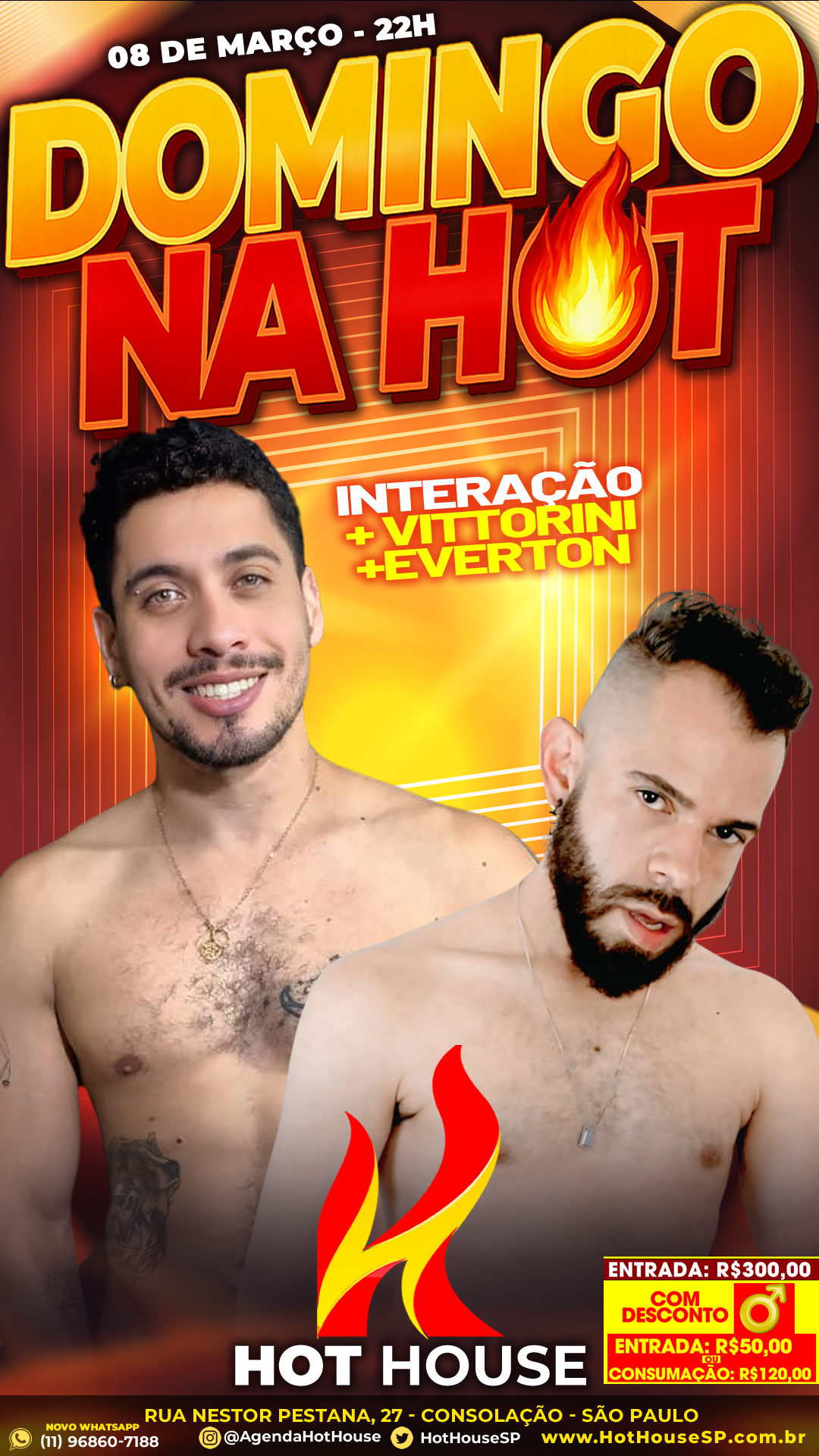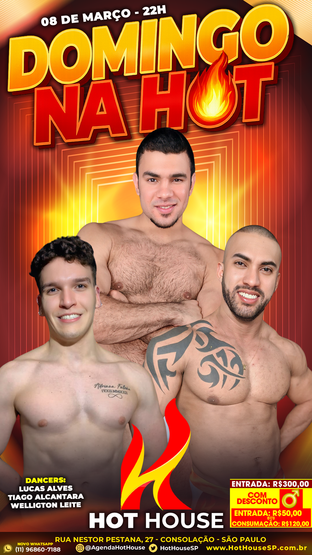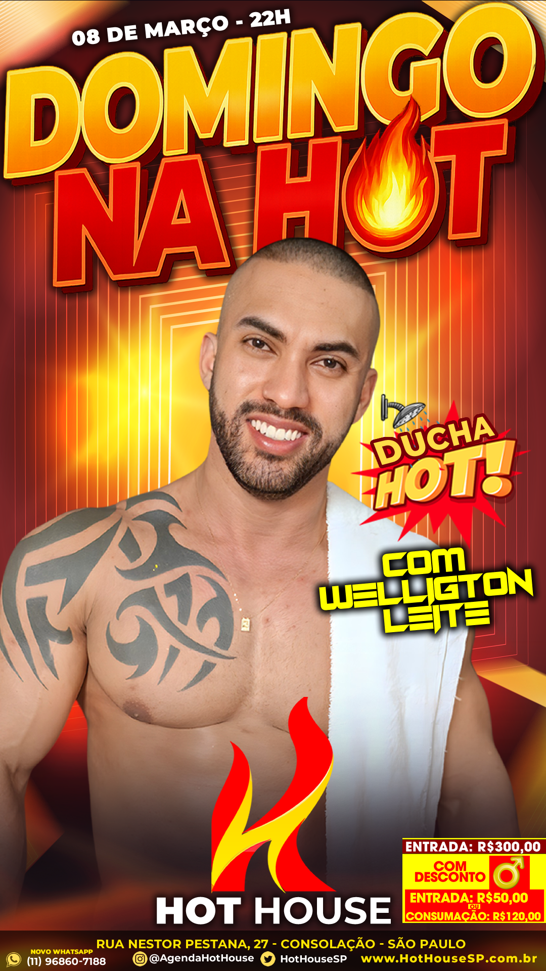 08mar(mar 8)10:00 pmDOMINGO NA HOT A Hot House São Paulo está de volta com a programação de domingo e promete uma noite animada para quem quer aproveitar a cidade depois das 22h. Hoje, 08 de março, acontece o DOMINGO NA HOT – Estamos de volta aos domingos!, reunindo performances ao vivo e muita interação com o público. No palco, a noite conta com os dancers Lucas Alves, Tiago Alcantara e Welligton Leite, trazendo apresentações especiais que fazem parte da experiência da Hot House São Paulo. Durante a noite também acontece a tradicional Ducha Hot especial com Welligton Leite, além de momentos de interação com Vittorine e Everton, que ajudam a animar ainda mais o ambiente. Conhecida por seu ambiente discreto e exclusivo, a Hot House São Paulo é um espaço de entretenimento noturno voltado ao público masculino, com bar, fumódromo, espaço reservado e apresentações ao vivo que tornam cada noite única. 📍 Hot House Se você curte eventos noturnos e experiências diferentes na cidade, essa é uma ótima opção para o domingo.