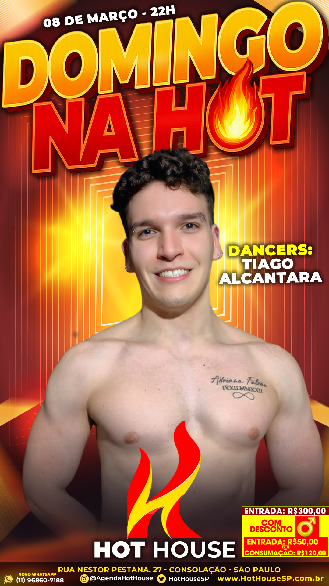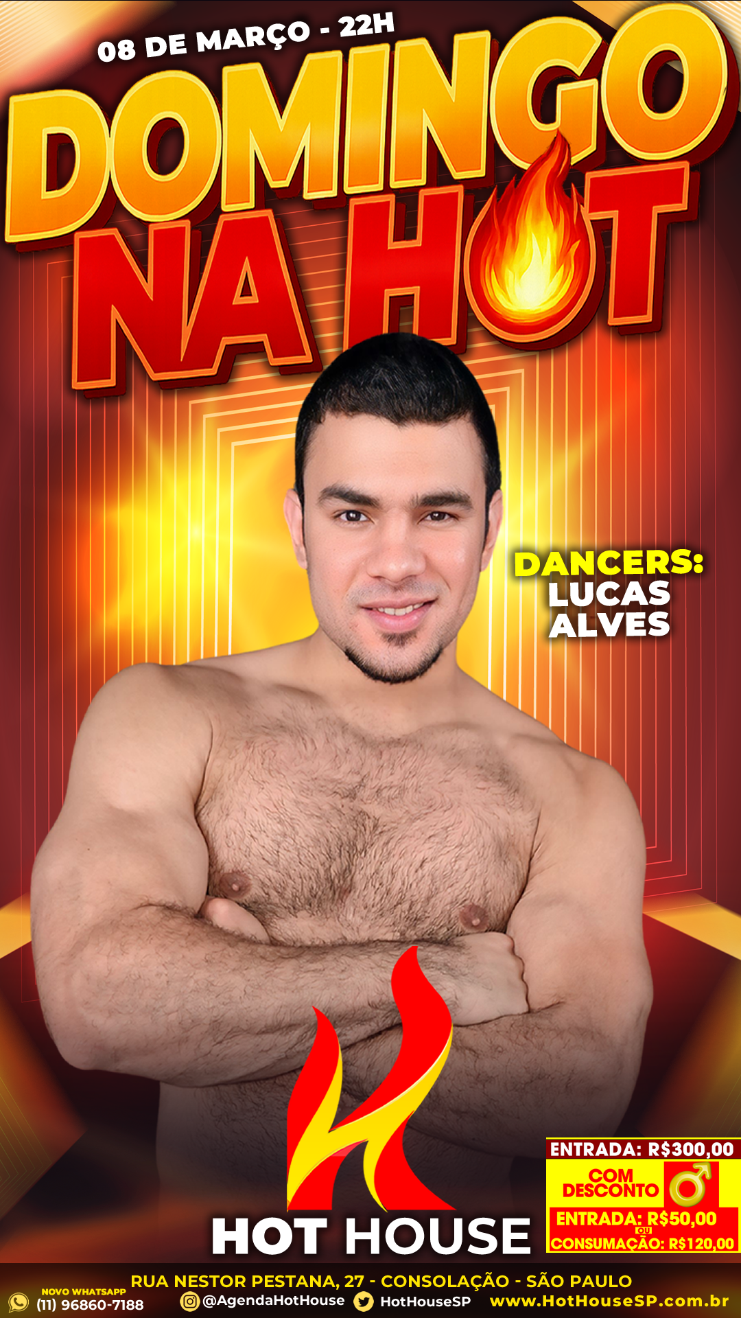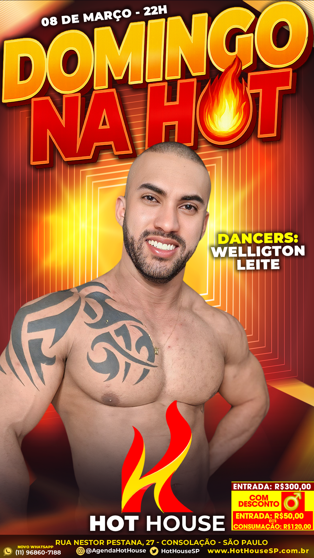 08mar(mar 8)10:00 pmDOMINGO NA HOT A Hot House São Paulo está de volta com a programação de domingo e promete uma noite animada para quem quer aproveitar a cidade depois das 22h. Hoje, 08 de março, acontece o DOMINGO NA HOT – Estamos de volta aos domingos!, reunindo performances ao vivo e muita interação com o público. No palco, a noite conta com os dancers Lucas Alves, Tiago Alcantara e Welligton Leite, trazendo apresentações especiais que fazem parte da experiência da Hot House São Paulo. Durante a noite também acontece a tradicional Ducha Hot especial com Welligton Leite, além de momentos de interação com Vittorine e Everton, que ajudam a animar ainda mais o ambiente. Conhecida por seu ambiente discreto e exclusivo, a Hot House São Paulo é um espaço de entretenimento noturno voltado ao público masculino, com bar, fumódromo, espaço reservado e apresentações ao vivo que tornam cada noite única. 📍 Hot House Se você curte eventos noturnos e experiências diferentes na cidade, essa é uma ótima opção para o domingo.