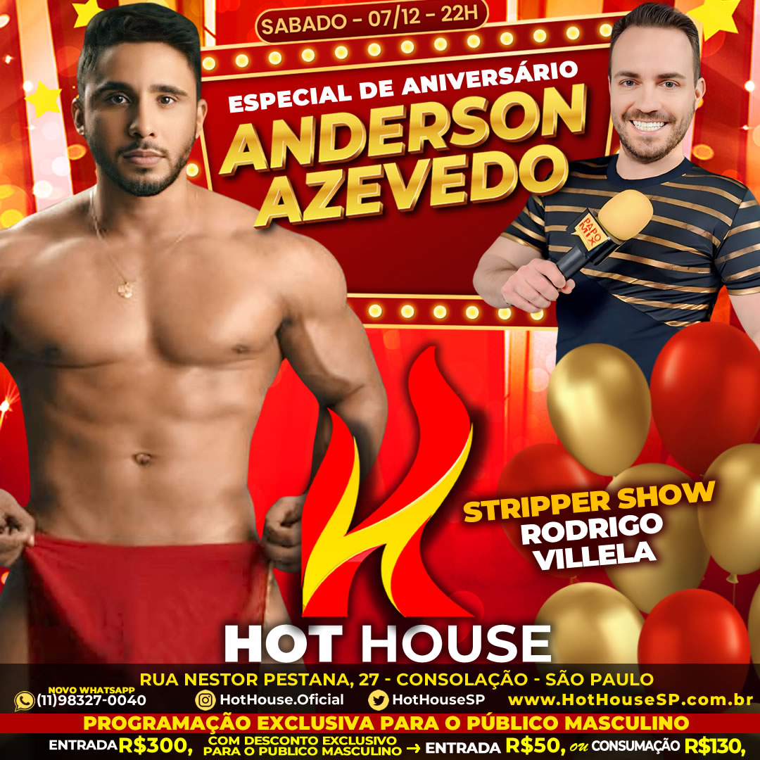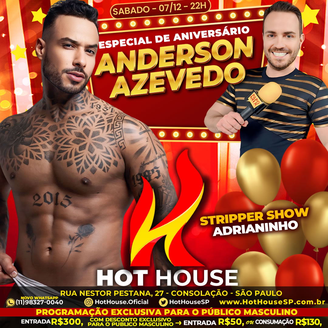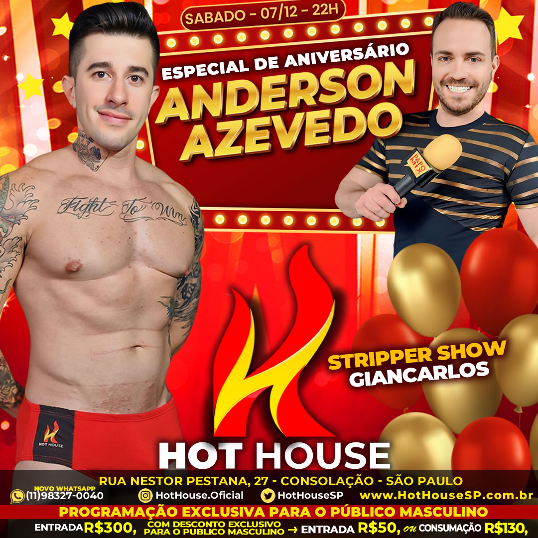 Neste fim de semana, a Hot House, reconhecida por oferecer entretenimento exclusivo para o público masculino, abre suas portas para comemorar o aniversário do jornalista e apresentador do PapoMix, Anderson Azevedo. A festa promete três dias inesquecíveis, repletos de atrações especiais, performances ousadas e muito glamour.